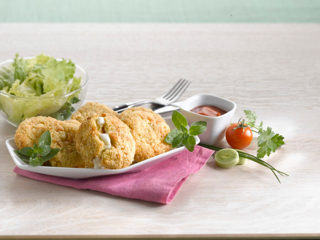 4. Gyúrj maximum 5 cm átmérőjű kis golyókat, lapítsd lepényformájúra és hempergesd zsemlemorzsába őket. Extra szűz olívaolajjal kikent tepsiben, 180°C-os sütőben süsd 15 percig.