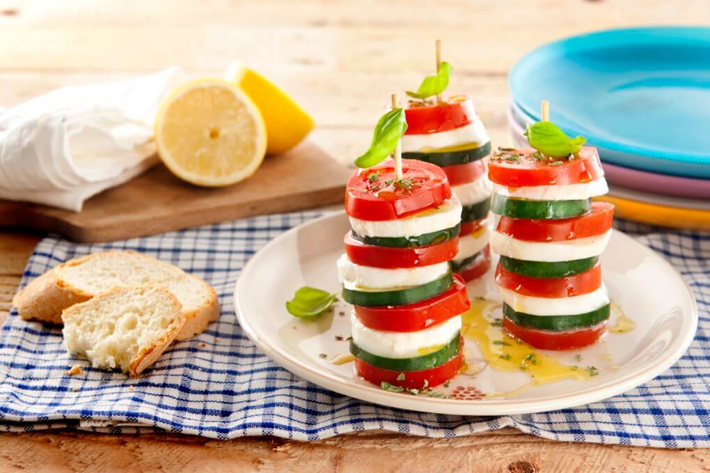 - Kezdd el felépíteni a tornyokat: egy paradicsom szelettel kezdd, majd helyezz rá egy szelet Mozzarellát, egy uborkát és így tovább; paradicsom szelettel zárd.