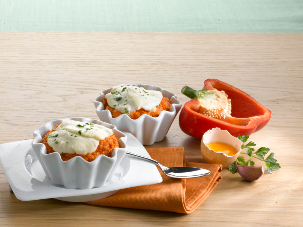 2. A piros paprikát süsd 180°C-on 10 percig, tedd át egy tálkába, és takard le átlátszó fóliával újabb 10 percre. Óvatosan bánj vele, amíg forró, nehogy megégesd a kezedet. Hámozd meg a paprikát, távolítsd el a magjait, és egy kis időre tedd félre.