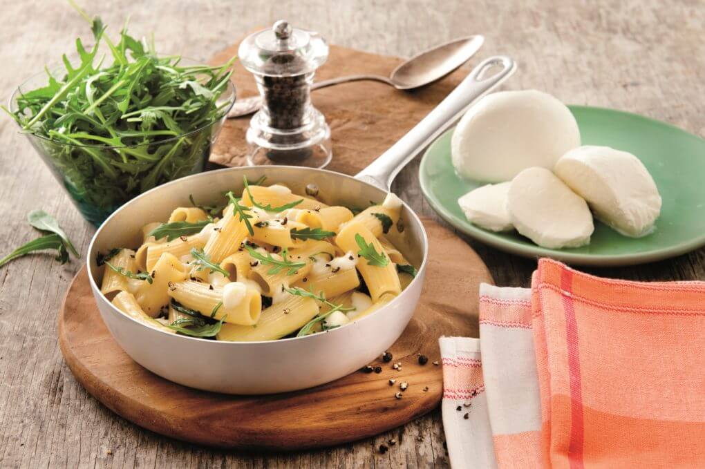 - Szedd ki a tésztát tányérokba, szórd meg az apró kockákra vágott Mozzarella sajttal, frissen őrölt borssal és azonnal tálald.