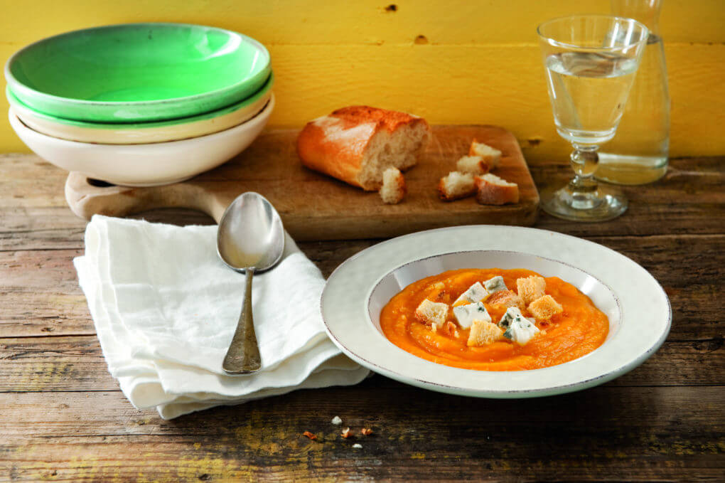- Az így elkészült meleg krémet öntsd leveses tálakba, és a tetejükre morzsolj Gorgonzola sajtot.