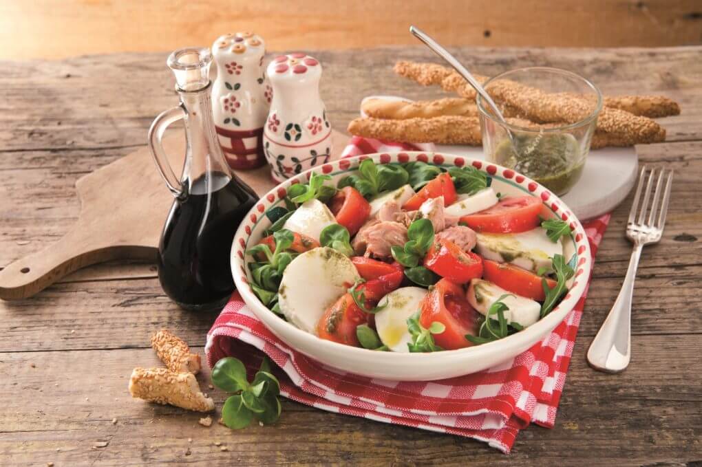 - Helyezd a közepébe a paprikát, a tonhalat, és rakd köréjük váltakozva a paradicsomcikkelyeket és a Galbani Mozzarella szeleteket.